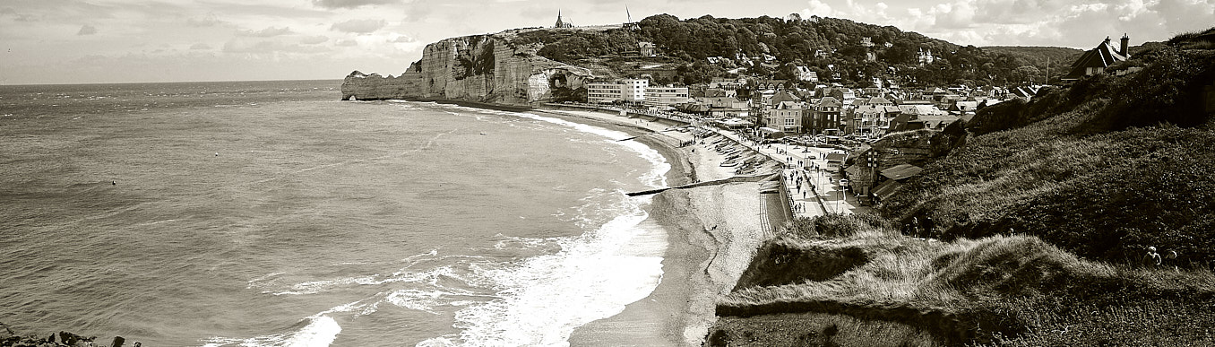 Etretat's seafront is flanked by two massive cliffs, both beautified by spectacular arches naturally formed in the limestone by the erosion of wind and waves, bearing witness to the geological past of the cliffs of Etretat. The Amont cliff, towered by the Notre-Dame-de-la-Garde chapel, which is regarded as the protector of fishermen, offers a breathtaking panorama. It has its own arch, which reminds to an elephant plunging its trunk into the water. The cliff of Aval is even more impressive, with its monumental arch and its 55 meter high needle. The panorama of Etretat's coast, which is truly among the most picturesque landscapes we've seen so far, has inspired many painters and writers alike.
